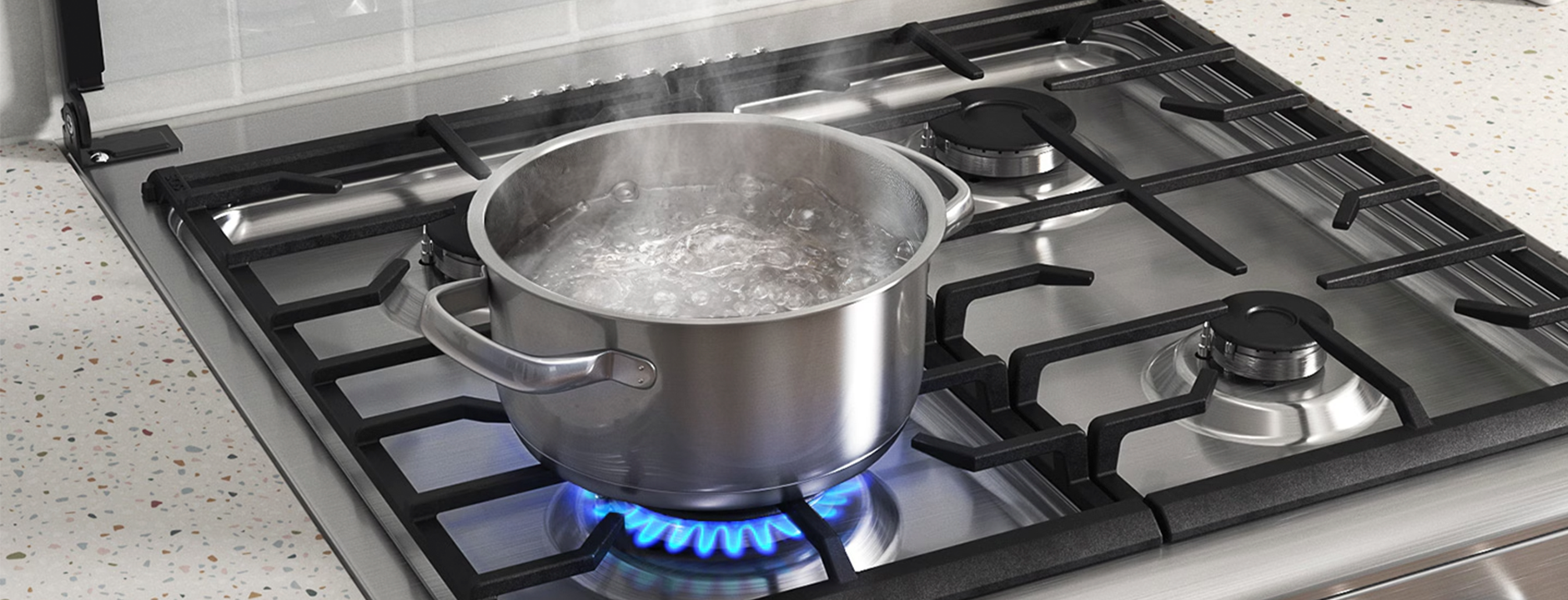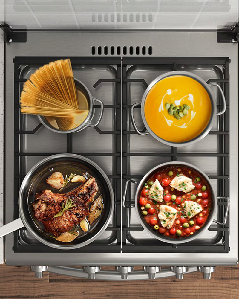 Disfruta de la flexibilidad de cocinar diferentes platos de diferentes tamaños a la vez. El diseño de rejilla ancha* de la zona de cocción amplia significa que puedes usar platos mucho más grandes y una mayor variedad de ollas. Sus pesadas rejillas de hierro fundido también proporcionan mayor estabilidad, por lo que hay menos riesgo de que las ollas y sartenes se vuelquen.