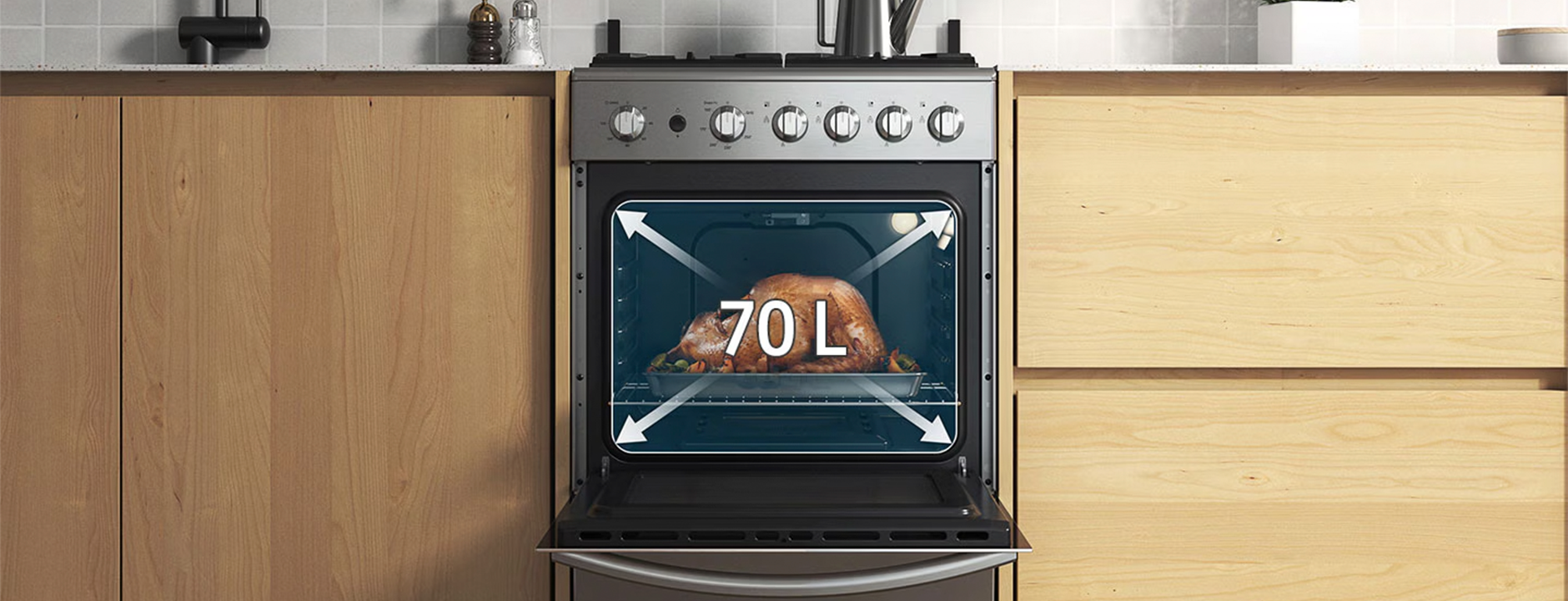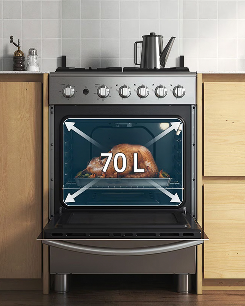 Disfruta de un mayor espacio para hornear gracias a su gran capacidad de 70 litros. Puedes preparar múltiples platos en diferentes niveles, como verduras, pasteles o guisos. También puedes preparar platillos grandes, como un gran pavo para cualquier ocasión.