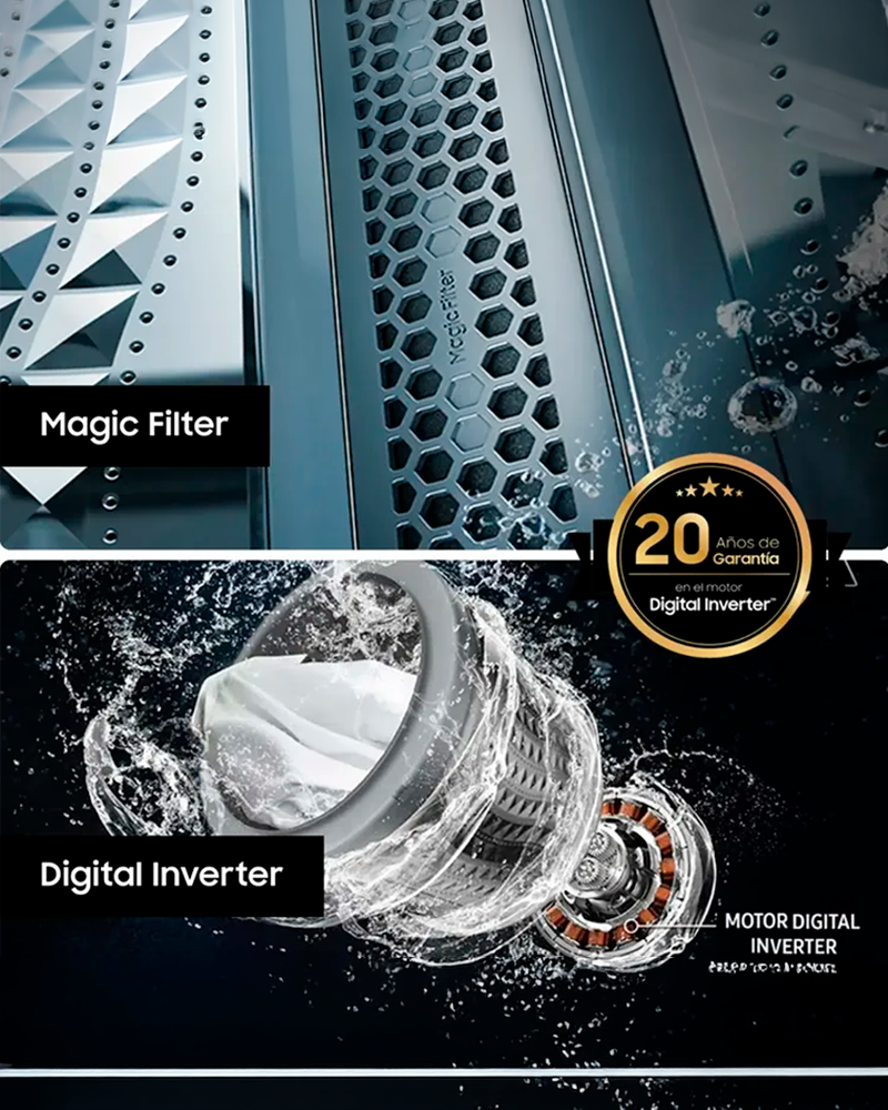 Disfruta de eficiencia y rendimiento duradero con la tecnología Digital Inverter, que utiliza imanes potentes para un rendimiento silencioso y potente con una eficiencia energética mejorada.También proporciona una durabilidad excepcional, respaldada por la garantía más larga* de la industria de 20 años en el motor.